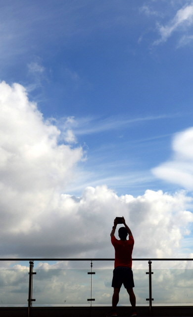 모처럼 맑은 날씨를 보인 22일 오전 서울 남산에서 한 외국인 관광객이 두 손을 한껏 올려 푸른 하늘을 촬영하고 있다.