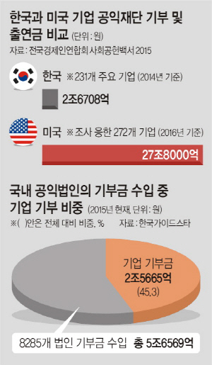 한국가이드스타에 따르면 2015년 국내 공익법인 8285곳의 총 기부금 수입(5조6569억 원) 중 기업이 낸 금액은 45.3%(2조5665억 원)를 차지했다.