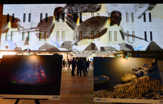 22일 극지연구소와 한국엡손이 서울 종로구 세종문화회관 뜨락마당에 설치한 미디어파사드(Media Facade)에서 남극의 자연환경을 담은 영상물이 시민들의 눈길을 끌고 있다.