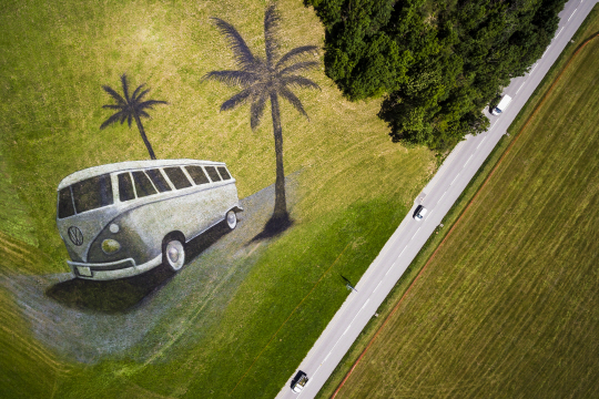 대자연에 작품을 표현하는 ‘랜드 아트’ 예술가 사이프가 스위스 샤또데 초원에 생물분해성 페인트로 그려 넣은 폭스바겐의 ‘마이크로버스’ 형상 옆으로 23일 차량들이 지나가고 있다.