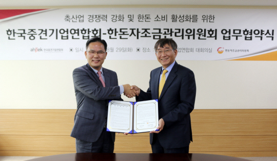 한돈자조금은 29일 서울 마포구 도화동에 위치한 중견기업연합회 대회의실에서 정상은 한돈자조금 사무국장, 김규태 중견련 전무가 참석한 가운데 축산업 경쟁력 강화 및 한돈 소비 활성화를 위한 업무협약(사진)을 체결했다고 30일 밝혔다.