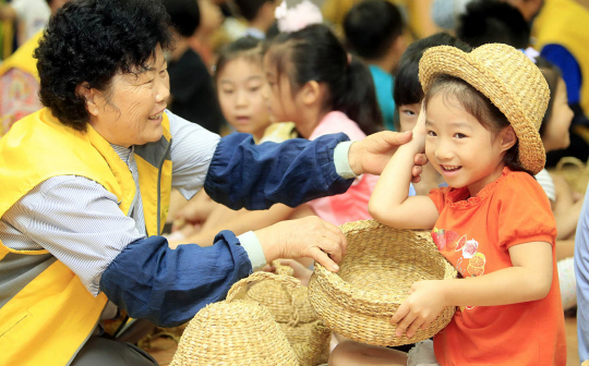29일 광주 북구 건국동 주민센터에서 열린 농촌문화체험학습에 참가한 어린이들이 짚풀 공예품 만들기 체험을 하며 즐거워하고 있다.