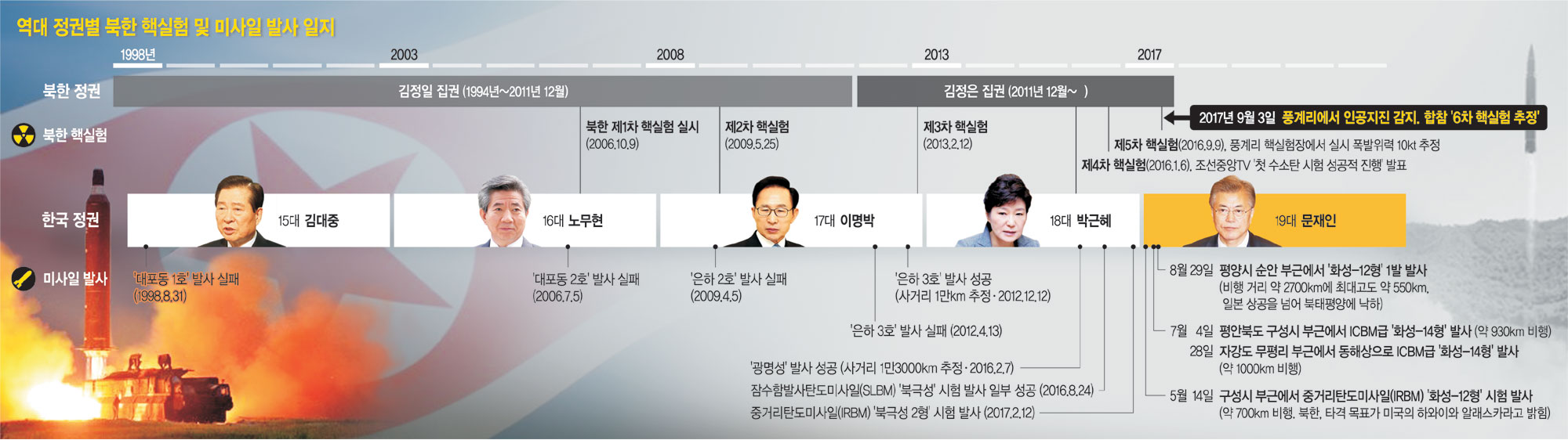 북한은 우선 이번 6차 핵실험에서 “ICBM 장착용 수소탄 시험에 완전히 성공했다”고 주장한 만큼 당분간은 미사일 도발에 집중할 가능성에 무게가 실린다. 지난해 1월 제4차 핵실험 이후 북한은 한 달 뒤 장거리미사일 ‘광명성 4호’를 발사했다. SLBM과 중거리미사일 무수단 발사도 감행했다. 지난해 9월 5차 핵실험 뒤에는 북극성-2형, 화성-12형 등을 발사했다. 북한이 지난달 23일 김정은 노동당 위원장의 국방과학원 화학재료연구소 현지지도 소식을 전하면서 신형 미사일인 화성-13형과 북극성-3형의 미사일 개념도를 고의로 노출한 만큼 곧 이들 미사일을 통한 추가 도발도 예상된다.