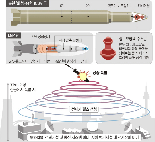 노동신문 등 북한 관영매체들은 6차 핵실험 직전인 3일 “우리의 수소탄은 전략적 목적에 따라 고공 폭발시켜 초강력 EMP 공격까지 할 수 있다”고 주장했다.
