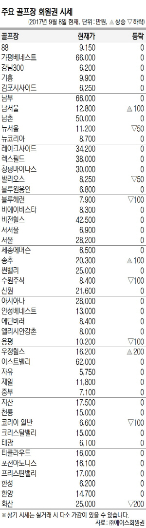 회원권 시장이 약보합세로 전환 중이다. 반복적인 북핵 위협에 내성이 생긴 터이지만 그 파급 효과가 이전보다는 높은 경향이다. 다른 자산시장의 흐름과도 연동해 움직이겠으나 점차 안정을 찾을 것으로 보인다. 초고가권에선 더 스타 휴와 비에이비스타 등 일부 무기명회원권을 제외하고는 렉스필드와 레이크사이드 등 대다수가 보합세다. 고가권 중 송추가 지속적인 상승세로 관심을 끌었고, 서울은 보합으로 전환했다. 중가권에선 남서울이 상승에 성공했지만, 강세를 보이던 수원이 하락으로 돌아섰고 블루헤런과 코리아(일반)도 조정 국면이다.