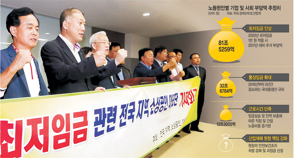 먼저 내년 최저임금이 올해보다 16.4% 급증한 7530원으로 결정되면서 기업의 추가부담액이 16조2151억 원(중소기업중앙회 추산)에 달할 것으로 예상됐고, 당초 정부 계획대로 2020년 1만 원까지 늘어날 경우 올해 대비 추가부담액이 81조5259억 원에 달할 전망이다. 정부는 세제 지원 등 임금인상에 따른 지원책을 마련했지만 부담 대부분은 중소기업과 영세 자영업자 몫이 될 가능성이 크다.