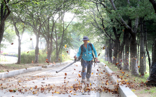 밤기운이 내려가 이슬이 맺힌다는 백로인 7일 서울 영등포구 양화동 선유도 공원에서 한 공원 작업반원이 송풍기로 낙엽을 치우고 있다.