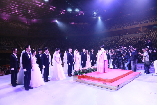 세계평화통일가정연합(한국회장 유경석) 창시자 문선명 총재 성화(타계) 5주년 추모제 및 국제합동축복결혼식(사진)이 7일 경기 가평군 청심평화월드센터에서 치러졌다. 이번 축복결혼식은 미국, 영국, 일본, 아르헨티나, 남아프리카공화국 등 64개국 신랑·신부 4000여 쌍과 인터넷 생중계를 통해 194개국에서 동참한 2만여 쌍 등 모두 2만4000여 쌍을 대상으로 진행됐다. 축복결혼식은 1961년부터 문선명·한학자 총재가 세계평화를 지향하는 의미로 진행했으며, 지난 2012년 문 총재 성화 이후 한 총재의 단독 주례로 지속하고 있다.