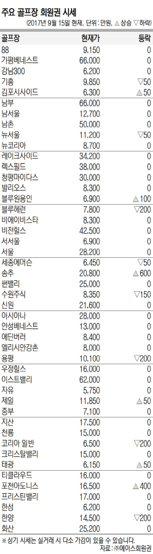 초고가권에선 거래가 부진한 가운데 더스타휴와 비에이비스타, 코리아 무기명에 주문이 유입되고 있다. 고가 종목 중에선 송추회원권이 이번 주에도 급등했다. 중가권에선 수원, 코리아의 약세가 두드러진 양상이나 김포와 블루원용인 등의 외곽권 종목이 상승했다.