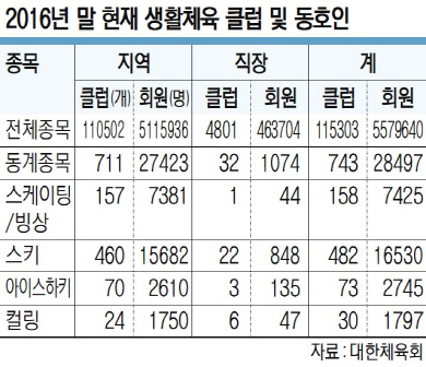 스키, 아이스하키, 컬링, 빙상 등이 동계생활체육의 축이다. 대한체육회에 등록된 동계종목 생활체육 동호인 수는 적지 않다. 지난해 말 기준으로 스키는 지역 클럽 460곳, 직장 클럽 22곳 등 모두 482곳에서 1만6530명의 동호인이 활동하고 있다. 스케이팅·빙상은 클럽 158곳, 7425명이고 아이스하키는 클럽 73곳, 2745명이며 컬링은 클럽 30곳, 1797명이다. 동호인으로 등록돼야 활동할 수 있는 건 아니기에, 실제 동호인 수는 등록된 것보다 많은 것으로 알려졌다. 스키장 방문객 수는 연 500만 명 정도다. 아이스하키의 경우엔 목동아이스링크의 31개 클럽을 포함, 서울 및 수도권 12개 링크를 대관하는 클럽은 모두 107개에 이른다.