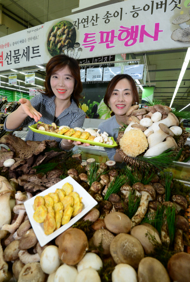 20일 서울 서초구 양재동 하나로마트 양재점에서 열린 자연산 버섯 특판 행사에서 직원들이 갓 출하된 능이 버섯, 송이 버섯 등을 소개하고 있다.