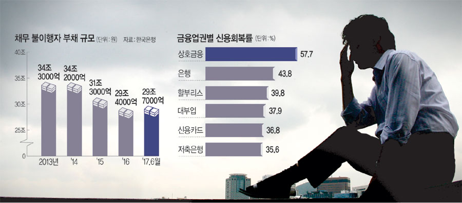 실제 한은에 따르면 올해 6월 말 현재 채무불이행자수는 104만1000명(전체 가계차주의 5.6%)으로 이들의 부채규모가 29조7000억 원(1인당 2853만 원)에 달하는 가운데, 2014년 새로 채무불이행자가 된 39만7000명을 추적한 결과, 3년 6개월이 지난 올해 6월 말 현재 19만4000명(48.7%)만이 신용을 회복했다고 밝혔다. 신용회복에 성공한 채무불이행자 중 13만3000명(68.4%)은 스스로 혹은 주변 도움 등으로 빚을 갚았다. 반면 3만9000명(20.1%)은 자력으로 벗어나지 못하고 정부의 채무조정제도 등 지원을 받았다.