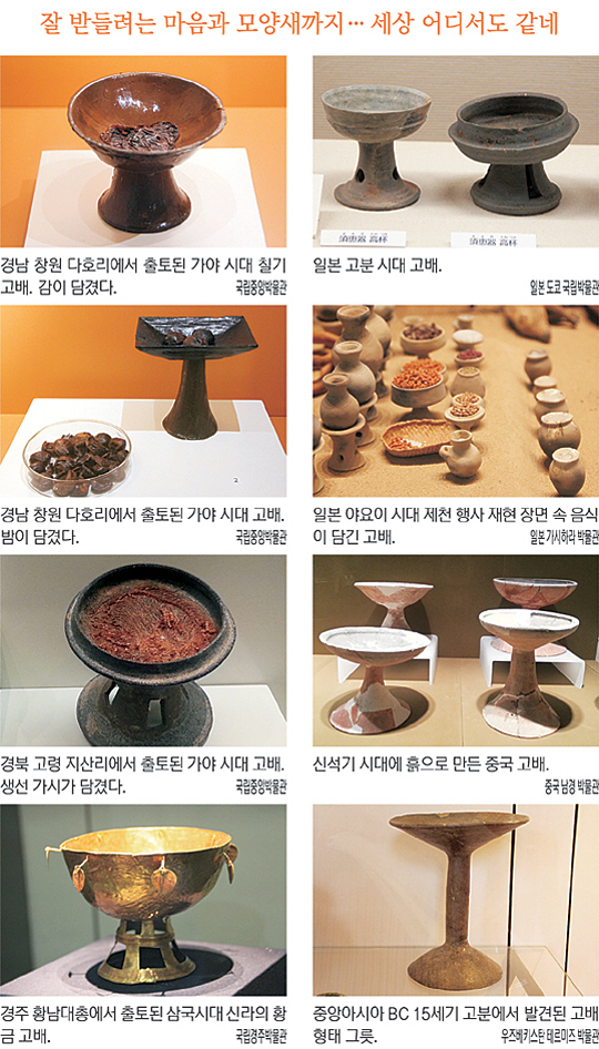 중국은 어떨까? 역사 고도 서안(西安, 예전 장안) 산시성 박물관으로 가면 공자(孔子·BC 551~BC 479) 시기보다 앞선 BC 8세기 주나라 고배가 눈길을 보낸다. 중국에서는 이를 ‘더우(두·豆)’라고 부른다. 발길을 역시 역사 고도 낙양(洛陽)으로 옮겨보자. 추석이면 TV에 자주 등장하는 민요. “낙양성 십리호에 높고 낮은 저 무덤은…” ‘성주풀이’에 등장하는 그 낙양 북쪽에 북망산(北邙山)이 있는데, 여기에 무덤을 많이 썼다. 그래서 ‘북망산’은 무덤을 상징하는 대유법으로 쓰인다. 낙양 박물관에는 주나라보다 훨씬 오래된 용산문화(龍山文化·BC 2500~BC 2000) 시기 고배가 기다린다. 남경(南京) 박물관에는 신석기 시대 흙으로 만든 고배가 전시돼 고배의 유구한 역사를 말해준다.