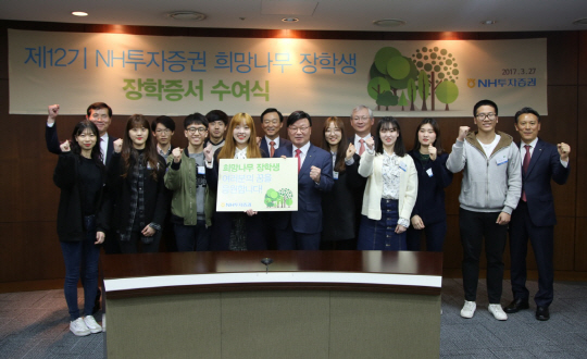 NH투자증권은 농협금융그룹의 일원으로서 범 농협 차원의 도농(都農) 혁신사업인 ‘또 하나의 마을 만들기’ 운동에 적극 참여하고 있다. 김원규 대표이사와 임원을 결연마을의 ‘명예이장’으로 위촉하고 소속 임직원들을 ‘명예주민’으로 참여시켜 상호 교감을 나누고 있다. 2005년부터 운영하고 있는 자발적 사내 기부금 모금제도인 ‘천사 펀드’도 회사의 대표 사회공헌 활동이다. 소아암 재단 환아 수술비 및 치료비 지원, 농촌 지역 의료·건강지원사업 등에 활용되고 있다. 우리 사회의 꿈나무들이 희망을 잃지 않고 학업에 정진할 수 있도록 돕는 학비 지원제도인 ‘희망나무 장학금’(사진)은 매년 저소득층 가정의 우수 고교생 40명에게 장학금을 지원하고 있다.