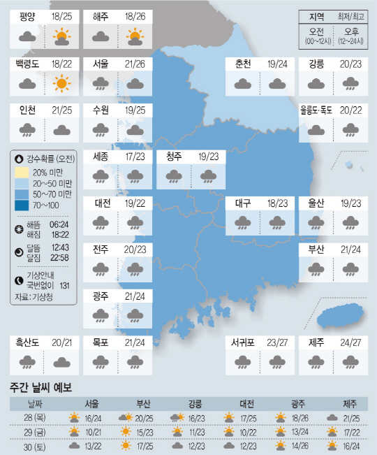 전국 대부분 지역에 비가 내리겠다. 아침 최저기온은 16도에서 22도, 낮 최고기온은 21도에서 26도가 되겠다.