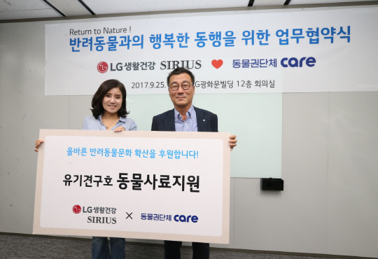 LG생활건강은 박헌영(사진 오른쪽) 대외협력부문 상무가 지난 25일 서울 종로구 새문안로 LG광화문빌딩에서 동물권단체 ‘케어’의 박소연 대표와 ‘LG생활건강 & 케어 반려동물과의 행복한 동행을 위한 업무 협약’을 체결했다고 27일 밝혔다. LG생활건강은 유기동물 구호 및 인식개선 교육, 반려견 사료 등을 지원한다.