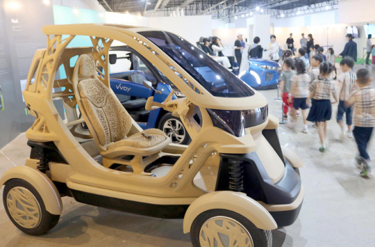 10일 광주 북구 광주비엔날레 전시관에서 관람객들이 3차원(D) 프린팅 기술을 활용해 제작된 자동차 등 전시품을 살펴보고 있다.
