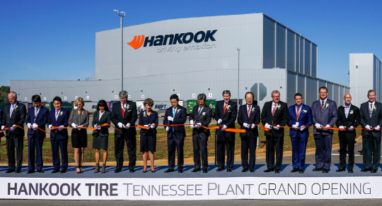 한국타이어는 17일(현지시간) 미국 테네시주 클락스빌에서 서승화 부회장 등 임직원과 빌 하슬람 테네시주 주지사 등 관계자 300여 명이 참석한 가운데 ‘테네시 공장’ 준공식(사진)을 했다고 밝혔다.