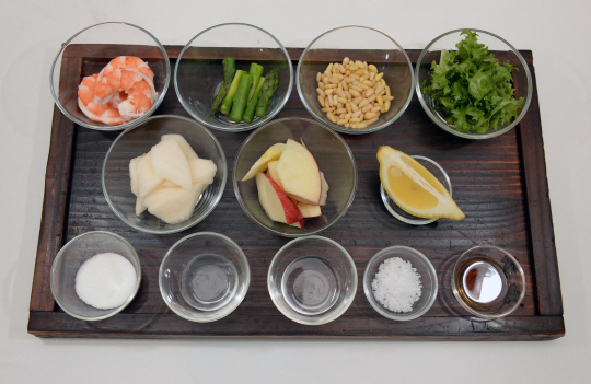 대하 5마리, 배 1/4개, 사과 1/4개, 아스파라거스 3줄기, 석류 1큰술, 치커리 약간, 잣즙소스(물 1과 1/2큰술, 식초 2큰술, 설탕 1과 1/2큰술, 소금 약간, 레몬 1/2개, 잣 3큰술, 국간장 1/2작은술)