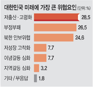 문화일보가 창간 26주년(11월 1일)을 맞아 실시한 여론조사에서 한국의 미래에 가장 큰 위협으로는 ‘저출산·고령화’를 꼽은 응답이 28.5%로 가장 높게 나왔다. ‘부정부패’(26.5%), ‘북한의 안보위협’(24.6%) 등이 뒤를 이었다.