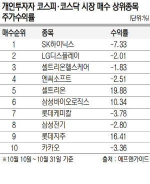 하지만 금융정보업체 에프앤가이드에 따르면 지난 10월 10일부터 31일까지 개인투자자들이 코스피·코스닥에서 가장 많이 사들인 10종목 중 7종목은 같은 기간 주가 수익률이 마이너스(-)로 나타났다. 순매수 규모 상위 1∼4위를 차지한 SK하이닉스, LG디스플레이, 셀트리온헬스케어, 엔씨소프트에서 각각 -7.33%, -2.01%, -1.83%, -2.51%의 수익률로 모두 적자를 봤다. 특히 1위 SK하이닉스의 순매수 규모는 9969억 원으로 2위 LG디스플레이의 2706억 원의 세 배를 넘어 손해가 막심할 것으로 예상된다. 5위 셀트리온, 6위 삼성바이오로직스, 9위 롯데지주 등 주가가 크게 오른 종목들 제외하면 전부 적자였다.