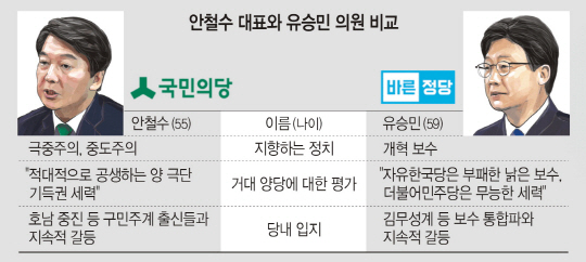 ◇소신인가 고집인가 = 안 대표와 유 의원은 닮은꼴이다. 학창시절부터 줄곧 엘리트코스를 걸어왔다는 점, 혼돈의 정치권에서도 뚜렷한 가치 지향점을 갖고 정치적 영향력을 확대해왔다는 점 등이 그렇다. 좌우 어디에도 경도되지 않고 민생에 집중하겠다는 안 대표의 ‘극중(極中)주의’에는 에마뉘엘 마크롱 프랑스 대통령처럼 제3의 정치로 승부를 보겠다는 의지가 담겨 있다. 유 의원의 브랜드는 ‘개혁보수’ ‘진짜 보수’다. 기득권에 매달리는 보수정치를 접고 중산층에 정책 지향점을 맞춰야 한다고 주장한다. 유 의원은 이러한 개혁보수를 ‘따뜻한 보수, 정의로운 보수’라고 불렀다.