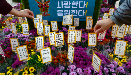 2018학년도 대학수학능력시험을 이틀 앞둔 14일 오전 서울 종로구 견지동 조계사에 진열된 국화꽃 화분에 학부모들이 자녀의 합격을 기원하는 팻말을 꽂고 있다.