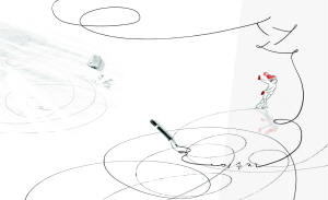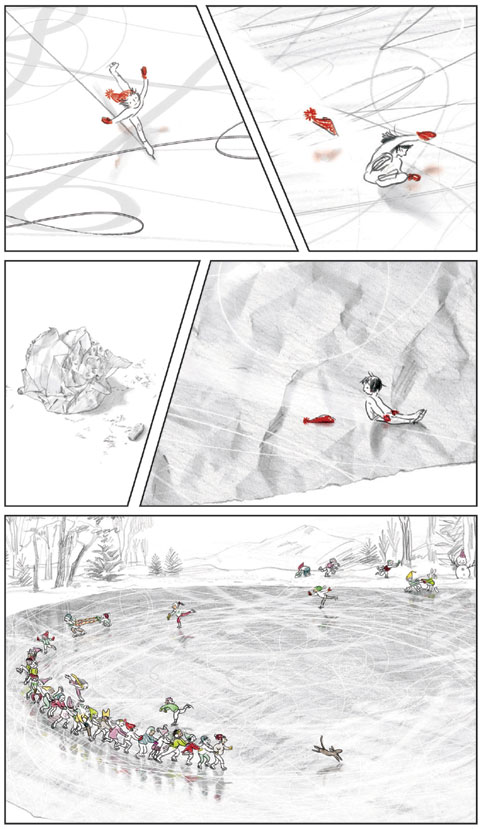 책을 펼치면 연필과 지우개가 놓인 빈 스케치북이 나온다. 이어 얼음판 위에 긴 선을 그리며 한 소녀가 등장한다. 소녀는 얼음판 위에 숱한 선을 만들며 스케이트를 타고, 미끄러지고, 회전한다. 그리고 뛰어오른다. 하지만 그만 중심을 잃고 바닥으로 추락한다. 순간 스케치북의 경계가 나타나고, 주변의 선들이 지우개로 지워진다. 소녀가 화가의 그림이라는 것이 드러난다. 그다음 장면은 구겨진 종이 뭉치. 자연히 그림에 실패한 화가가 떠오른다.