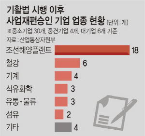 2017년 7월 기준으로 기활법 후 현재까지 승인된 40개 기업 중 중소기업이 30개, 중견기업이 4개, 대기업이 6개로, 중소·중견기업이 전체의 85%를 차지하고 있다. 조선·해양플랜트 18개, 철강 6개, 석유화학 3개 등 3대 구조조정 업종이 27개로 전체의 67.5%를 차지할 정도로 실적을 내고 있다.