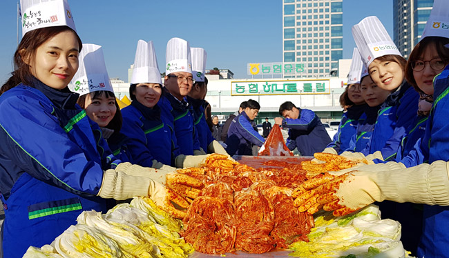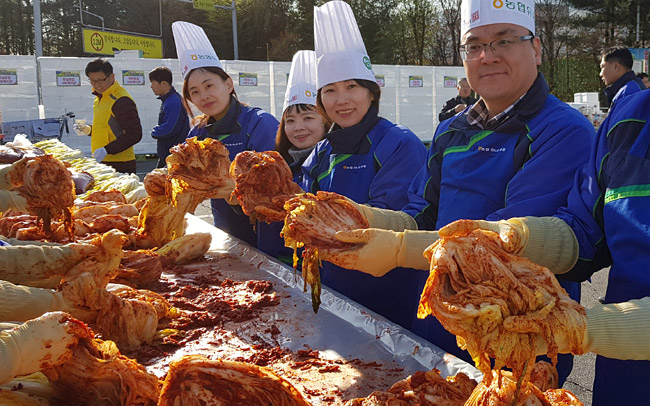 20일 오전 서울 서초구 양재동 농협하나로클럽에서 (주)농협유통 임직원들이 저소득취약계층에 나눠줄 김장김치를 담그고 있다.