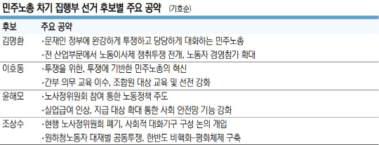 이에 반해 현 지도부의 지지를 받는 이호동 후보는 대정부 투쟁을 공약으로 내세웠다. 이 후보는 대화와 타협을 거부하는 강성 노선인 ‘현장파’로 분류된다. 이 후보는 “사회적 합의주의는 배신, 타락과 부패, 출세주의의 다른 이름”이라며 “사회적 대타협은 대화 합의 타협으로 위장한 노동자 양보의 강제이고, 투쟁 없는 교섭은 쟁취도 없다”고 강경한 입장을 고수하고 있다.