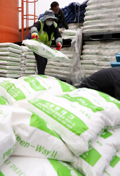 서울에 첫눈이 내린 20일 서울 관악구 제설전진기지에서 구 관계자가 염화칼슘 등 제설용품을 배포하기 위해 옮기고 있다.