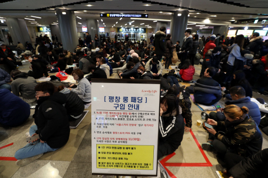 22일 오전 서울 송파구 롯데백화점 잠실점 에비뉴엘 지하 입구 앞에서 ‘평창 롱패딩’을 사려는 시민들이 밤을 지새우며 기다리고 있다.