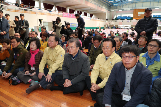 문재인 대통령이 24일 오전 지진 피해 이재민들이 머물고 있는 경북 포항시 흥해실내체육관을 방문해 이재민들과 함께 신발을 벗은 채 마룻바닥에 앉아있다. 문 대통령 왼쪽은 김부겸 행정안전부 장관, 오른쪽은 김관용 경북지사.