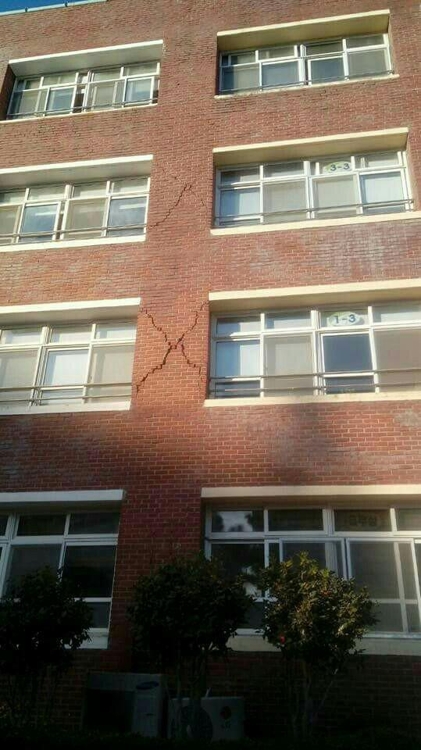 외부 벽돌에 엑스(X)자로 금이 갔고 벽이나 천장에 콘크리트 조각과 마감재가 부서진 곳도 많다.