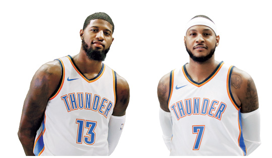 29일 오전(한국시간) 공개된 영국 스포팅 인텔리전스의 ‘2017 세계 스포츠 연봉 연감’에 따르면 오클라호마시티 선수단의 평균 연봉은 929만5504달러(약 100억7000만 원)로 조사 대상 16개국, 29개 리그의 465개 팀 중 가장 높다. 오클라호마시티는 지난해 조사에서 33위였으나 폴 조지(왼쪽 사진), 카멜로 앤서니(오른쪽) 등을 영입하면서 연봉이 대폭 상승했다. 조지의 연봉은 1950만8958달러(211억5000만 원), 앤서니는 2624만3760달러(284억6000만 원)이다.