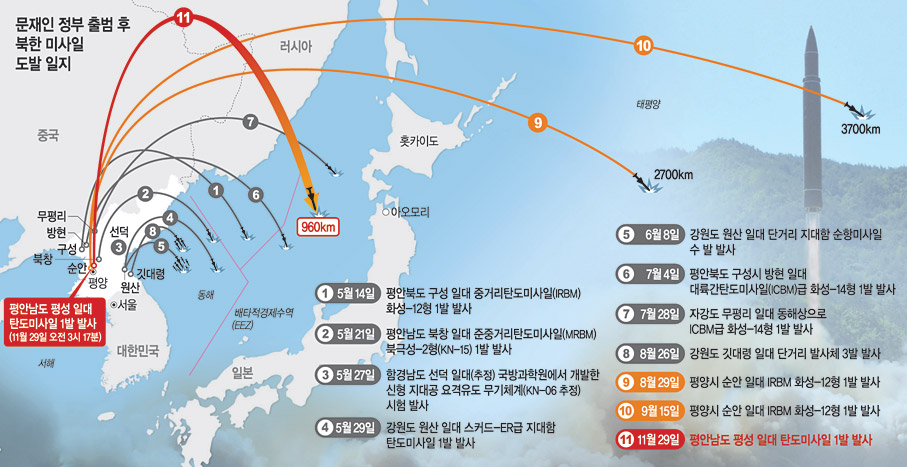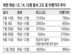 북한이 29일 발사한 장거리탄도미사일은 역대 최고고도까지 오른 점 등을 감안하면 미국 본토 전역을 사정권에 둔 역대 최대사거리를 갖춘 것으로 평가된다. 특히 정상각 발사 시 사정거리가 1만3000㎞로 추정되면서 북한이 미국과 러시아가 보유한 수준의 대륙간탄도미사일(ICBM) 사거리에 도달한 것으로 해석된다.