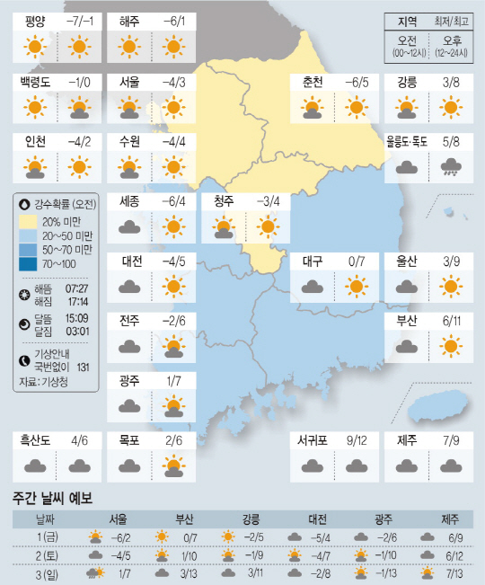 전국이 대체로 맑겠고 제주는 대체로 흐리겠다. 아침 최저기온은 영하 8도에서 영상 6도, 낮 최고기온은 2도에서 11도가 되겠다.