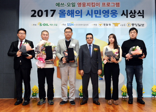 오스만 알 감디(오른쪽 세 번째) 에쓰오일 CEO는 28일 서울 마포구 공덕동 사옥에서 열린 ‘2017 올해의 시민 영웅 시상식’에서 위험에 처한 이웃을 구한 의인 18명에게 상금 1억4500만 원을 전달했다. 물에 빠진 친구를 구하고 본인은 안타깝게 숨진 고교생 고 황선후 군(아버지 대리 수상) 등이 상금과 상패를 받았다.