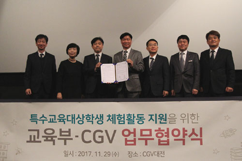 CJ CGV(대표이사 서정)는 29일 CGV 대전에서 교육부(부총리 겸 교육부장관 김상곤)와 특수학교 자유학기제 체험 지원 활성화를 위한 업무 협약을 체결했다. 협약식에는 CJ CGV 조성진 전략지원담당, 신익현 교육부 지방교육지원국장을 비롯해 관계자 10명이 참석했다.