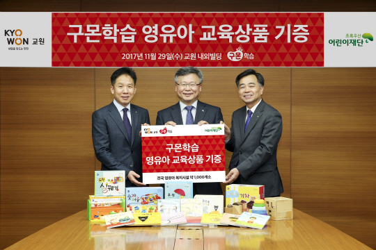교원그룹은 29일 서울 중구 을지로 교원 내외빌딩에서 김춘구(사진 가운데) 구몬사업본부장과 정원만(왼쪽) 초록우산 어린이재단 부회장, 심형래 영등포종합사회복지관장 등이 참석한 가운데 기증식을 했다고 1일 밝혔다. 교원그룹은 이번 기증과 관련, 자사가 교육업체 중 최초로 인성을 주제로 전개하고 있는 사회공헌활동인 ‘바른 인성 캠페인’의 하나라며, 총 3억 원에 달하는 구몬학습의 영·유아를 위한 그림책과 교구 1000세트를 전국 1000개 복지기관에 기증하는 것이라고 설명했다.