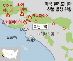6일 로스앤젤레스타임스(LAT)에 따르면, 이날 UCLA 인근 405번 주간고속도로 주변에서 ‘스커볼 파이어’로 명명된 산불이 발생해 150에이커(약 60만7000㎡) 규모의 지역을 태우며 무섭게 확산하고 있다. 화재 지역은 미 서부의 대표적 부촌인 ‘벨 에어(Bel Air)’를 비롯해 UCLA캠퍼스, 유명 박물관인 게티센터 등이 인접해 있다. UCLA는 이날 고속도로 폐쇄 및 산불 위험 등을 이유로 수업을 취소하는 등 조치에 나섰다.