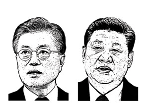 북한이 대륙간탄도미사일(ICBM) 기술 완성을 천명한 시점에서 다음 주 열리는 세 번째 한·중 정상회담은 문재인(왼쪽 얼굴) 정부의 외교 안보 정책에 중요한 분수령이 될 것으로 보인다. 문재인 대통령은 취임 후 시진핑(習近平·오른쪽) 중국 국가주석과 두 차례 회담을 갖고 고고도미사일방어체계(THAAD·사드) 한반도 배치로 촉발된 한·중 갈등을 가라앉혔지만, 개운치 않은 뒷맛과 함께 한·미 동맹에 이상 신호가 들어왔다는 해석도 끊이지 않았었다. 이번 방중이 북핵 문제와 미·중 관계 등 중요한 외교 정책 기본 노선과 관련한 혼선을 정리할 수 있는 계기가 될 수 있을지 주목된다.