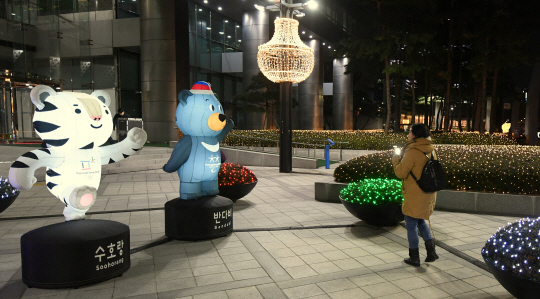 7일 서울 강남구 대치동 포스코센터 앞에 점등된 ‘2018 평창동계올림픽’ 공식 마스코트 수호랑과 패럴림픽 마스코트 반다비 앞을 시민이 지나가고 있다. 평창동계올림픽 공식 파트너(후원사)인 포스코는 올림픽 종료 시점인 내년 2월 25일까지 경관 조명을 운영한다.