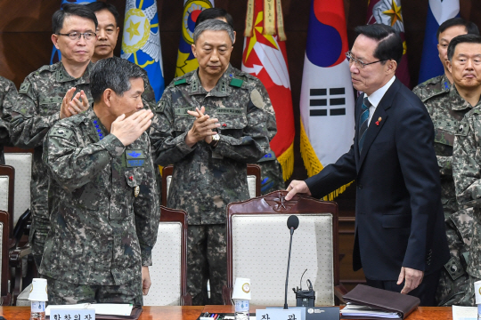 송영무(앞줄 오른쪽) 국방부 장관이 8일 오전 서울 용산구 국방부 대회의실에서 열린 ‘2017년 연말 전군 주요 지휘관회의’에서 정경두 합참의장의 경례를 받고 있다.