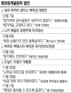 대북 강경파로 분류되는 허버트 맥매스터 백악관 국가안보보좌관도 미국의 평창동계올림픽 불참 가능성을 시사한 적은 없다. 그는 지난 2일 캘리포니아에서 열린 레이건 국방포럼에서 ‘내년 2월 평창동계올림픽에 참가하는 것이 안전하냐’는 포럼 진행자의 질문에 “안전하다”고 확답했다.
