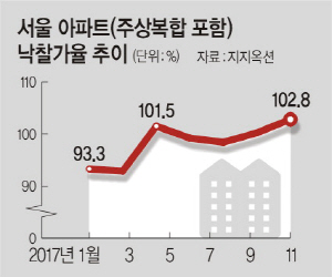 11월 서울아파트 낙찰가율도 102.8%로 역대 최고치를 기록했다. 특히 서울아파트 경매시장은 8·2 대책 영향을 본격적으로 받은 10월보다 낙찰률(57.3%→56.9%)과 응찰자(6.6명→6.3명)가 모두 떨어졌는데 낙찰가율은 올라갔다. 특히 서울 강남 3구(강남·서초·송파구)의 낙찰가율은 107.0%로 8·2 대책 이전 수준을 회복한 것은 물론이고 역대 최고치를 기록했다. 경매업계 관계자는 “전체 경매지수가 떨어질 것이 예측되는 만큼 경매 참여에 신중해야 할 것”이라고 말했다.