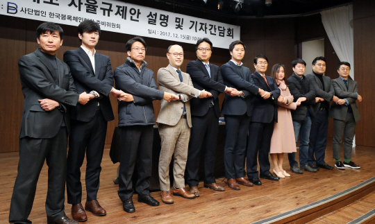 15일 서울 중구 명동 은행회관 국제회의실에서 열린 ‘암호화폐 거래소 자율규제안 설명 및 기자간담회’에서 참석자들이 자율규제안 발표 뒤 손을 맞잡고 기념촬영을 하고 있다.
