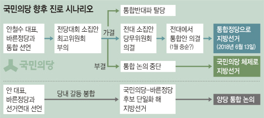 안 대표의 통합 선언이 초읽기에 들어갔다는 관측이 나오면서 향후 당 진로를 놓고 다양한 시나리오가 거론되고 있다. 내년 2월부터 진행되는 지방선거 예비후보 등록 일정을 감안하면 12월 임시국회가 끝나는 23일쯤 통합 선언을 한 뒤 최고위·당무위·전당대회 순서로 이어지는 합당 의결 절차를 1월 내 마무리해야 한다는 의견이 나온다.