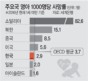 우리나라 영아 사망률은 경제협력개발기구(OECD) 35개국 중 12위 수준인 것으로 조사됐다. 우리나라는 지난해 영아 1000명당 사망률이 2.9명으로, OECD 평균(3.7명)보다 낮은 수치를 기록했다. 아이슬란드가 1.6명으로 가장 낮았다. 회원국 중 영아 사망률이 가장 높은 국가는 멕시코(12.6명)였고, 터키(10.9명), 칠레(7.2명), 미국(5.6명)이 뒤를 이었다. 비회원국인 중국은 8.5명, 북한은 15.1명이다. 소말리아는 전 세계에서 가장 높은 82.6명을 기록했다.